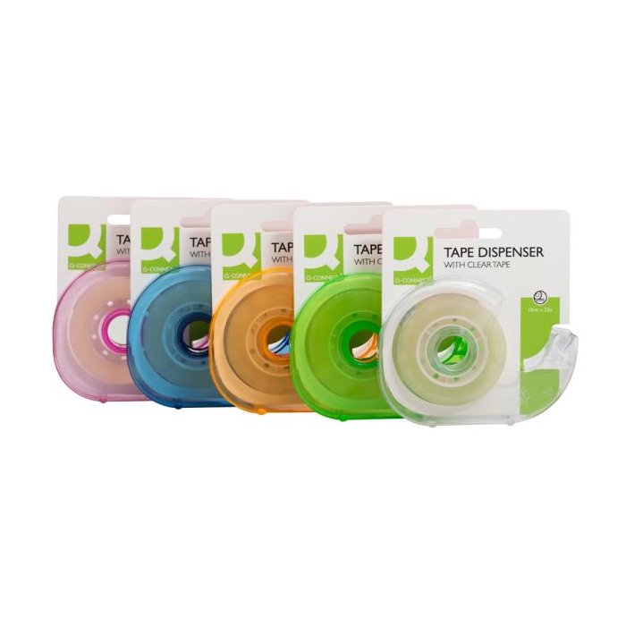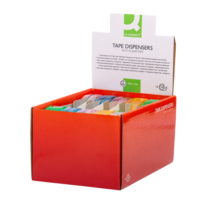 Priehľadná lepiaca páska Q-CONNECT rozmerov 19 mm × 33 m s dispenzorom. Dodávaná v mixe farieb bez možnosti výberu.