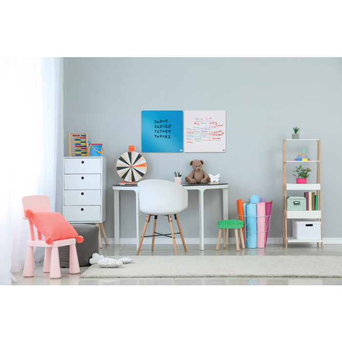 Kompaktné magnetické dielce stierateľné za sucha majú ideálnu veľkosť pre každý pracovný stôl, doma i v kancelárii. Obsahujú dva magnety, biely popisovač s mazacou hubou a montážnu penovú pásku. Farba: modrá. 360 × 360 mm.