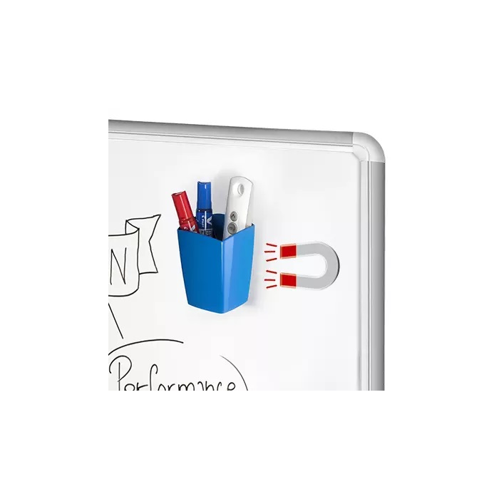 Dômyselne navrhnutý magnetický stojan na perá vám umožní mať vždy po ruke popisovače na tabuľu a malé kancelárske potreby. Ideálny na magnetické tabule a ploché kovové povrchy. Nevhodné pre použitie na magnetické sklenené tabule. Zadná strana vybavená magnetom unesie až 300 g. Kapacita: 8 popisovačov na tabuľu/1 diaľkový ovládač/1 blok Post-It®... Celkový rozmer: 78 x 74 H 95 mm. 100% recyklovateľný, vysoko kvalitný plast PS.