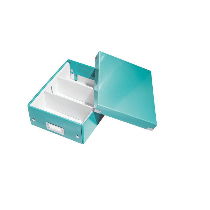 Malá štýlová skladacia krabica s vekom a s rámčekom na štítok. Na usporiadanie nabíjačiek, káblov a ďalšieho vybavenia kancelárie. Veľkosť S. Na prvý pohľad vidíte, čo sa vojde dovnútra! Výška krabice bola navrhnutá tak, aby vám poskytla dostatok priestoru na uloženie príslušenstva a zároveň zabránila skladaniu vecí na seba. Na vylepšenie usporiadania obsahu krabice použite priložený vnútorný systém priehradiek. Môžete rozdeliť krabicu na 2 alebo 3 časti a zabrániť tak miešaniu káblov alebo fotiek. Inteligentná skladacia konštrukcia: rýchle a jednoduché zloženie bez nutnosti použitia skrutiek a možnosť opätovného rozloženia na úsporu miesta, keď krabicu práve nepotrebujete. Moderný vzhľad a farby na skrášlenie vašej kancelárie alebo domova. Lesklé vyhotovenie vytvára prvotriedny vzhľad škatule a umožňuje dlhodobé používanie a jednoduché utieranie prachu. Rámček na štítok pre jednoduché označenie obsahu. Materiál pevný kartón potiahnutý polaminovaným papierom. Farba ľadovo modrá.