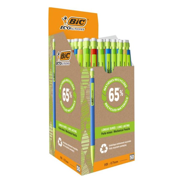Mechanické ceruzky BIC Matic ECOlutions s certifikovanou ekologickou značkou NF Environnement - prvá vo svojej triede. Sú vyrobené zo 65 % recyklovaných materiálov a dodávajú sa so štyrmi tuhami HB s priemerom 0,7 mm a dĺžkou 9 cm, ktoré zabezpečujú plynulé a presné písanie, takže vám vydržia po celú dobu. Dodávané náhodne s telom v zelenej, modrej alebo sivej farbe.