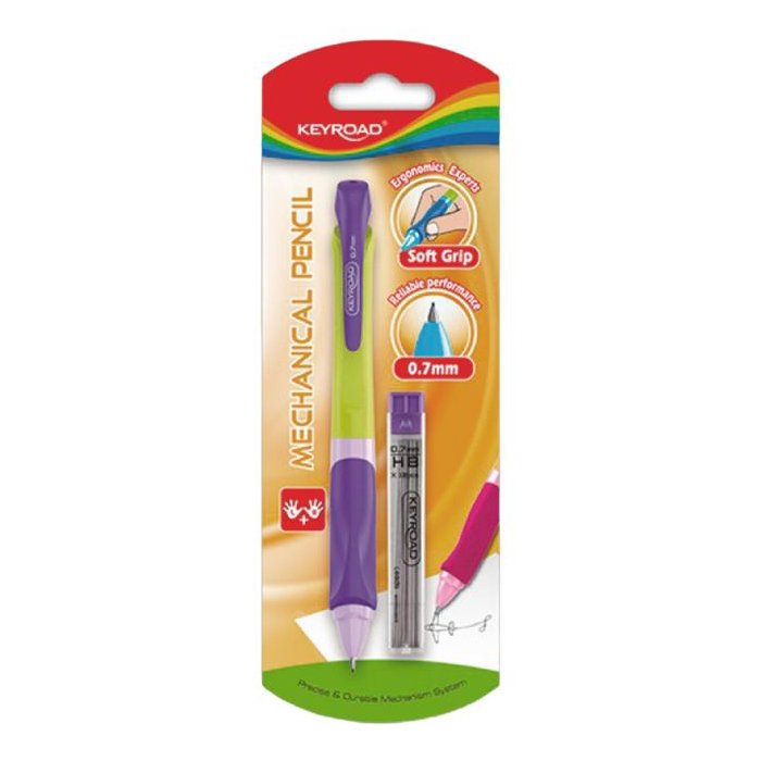 Mikroceruzka KEYROAD Smozzy Writer, mechanická. Pogumovaná rukoväť s protišmykovými drážkami v ergonomickom tvare. Vhodná pre pravákov aj ľavákov. Priemer tuhy 0,7 mm. Balenie: blister. Farba: mix farieb.