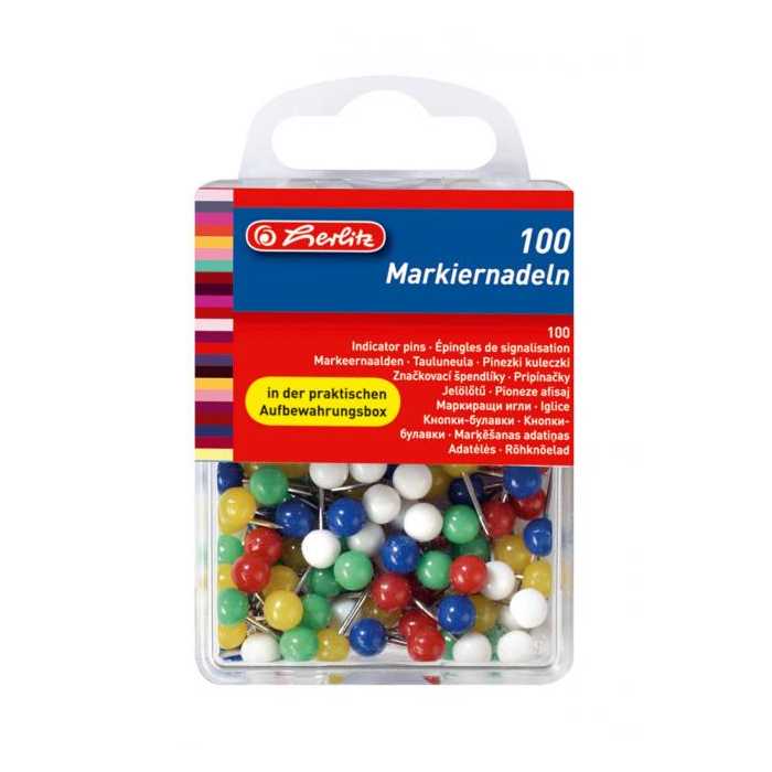 Guľaté špendlíky určené na vyznačenie bodov na mapách, plánoch, organizačných a vývesných tabuliach. Priemer hlavičky 6 mm. Balenie 100 kusov v mixe farieb.
