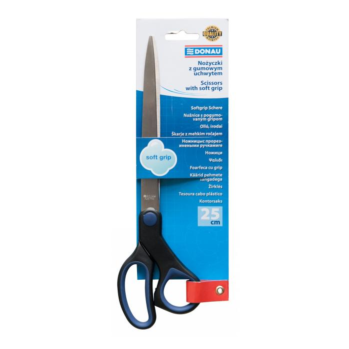 Kancelárske nožnice na strihanie papiera, kartónu, lepenky, samolepiacej pásky a pod. s pogumovaným úchytom a strihacou časťou z nehrdzavejúcej ocele. Farba čierna/-modrá.