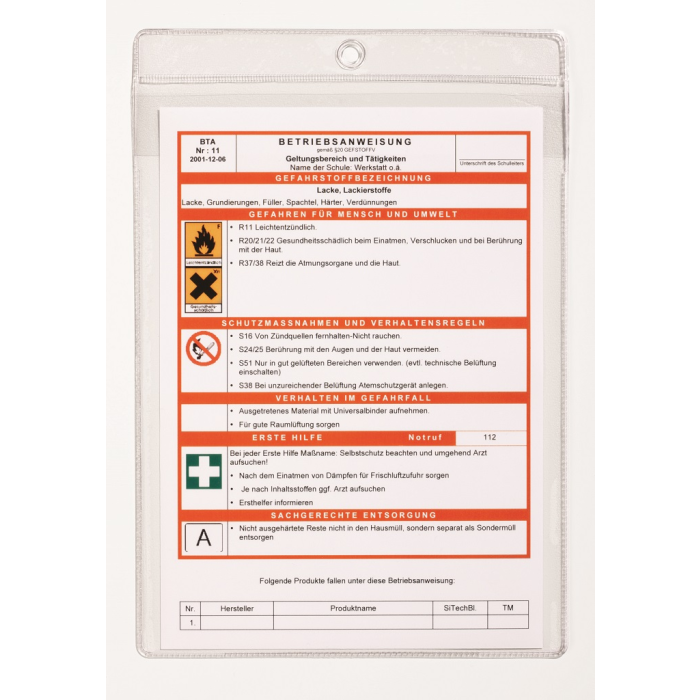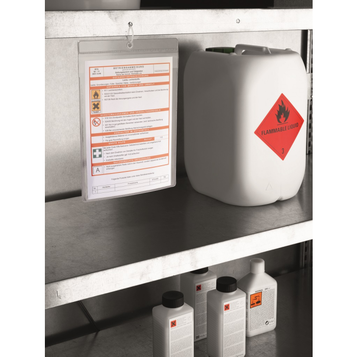 Priehľadný obal na dokumenty z extra silného polypropylénu na dôležité informácie a upozornenia. Ochranná klopa, otvor zhora, krúžok na zavesenie. Formát A4. V balení 10 ks.