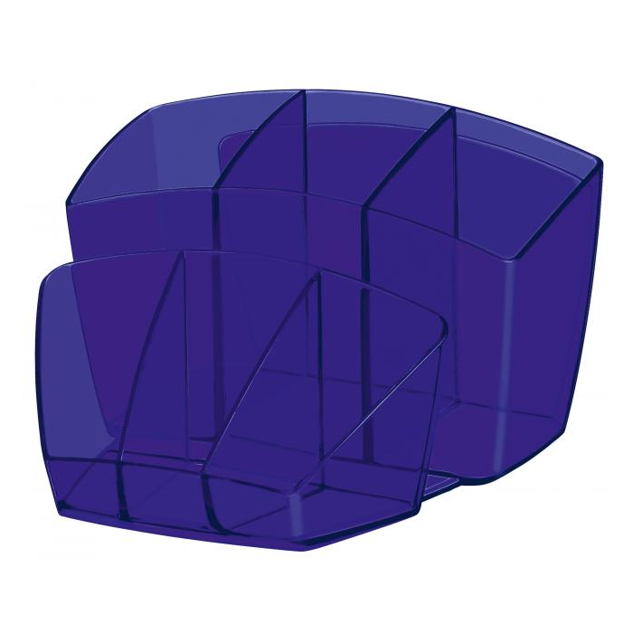 Dômyselne navrhnutý kompaktný a elegantný stolný organizér na kancelárske príslušenstvo. Kapacita: 40 pier, 5 zvýrazňovačov a 3 všeobecné priehradky. Na spodnej časti protišmyková podložka. Celkové rozmery 143 × 158 × 93 mm. 100% recyklovateľný, vysokokvalitný plast. Väčšie balenie 6 ks. Farba transparentná modrá.
