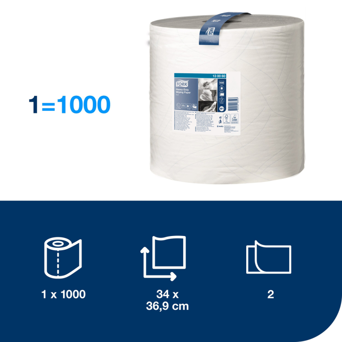 2-vrstvová viacúčelová papierová utierka Tork Heavy-Duty je ideálna na utieranie tekutín a ručné utieranie. Túto papierovú utierku možno použiť v Tork nadstavcových zásobníkoch na podlahu či na stenu, ktoré sú vyvinuté pre bezpečnosť, účinnosť a spoľahlivosť s jednoduchým napĺňaním a odtŕhaním a možnosťou vybrať požadovanú papierovú utierku jednou rukou.