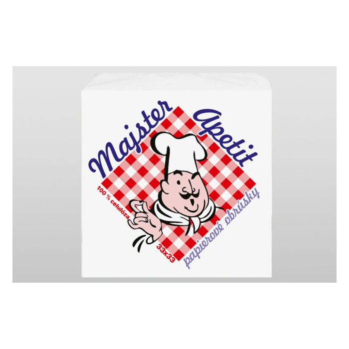 Jednovrstvové papierové servítky Majster Apetit. Rozmery 330 × 330 mm. Väčšie balenie: 40 balení.