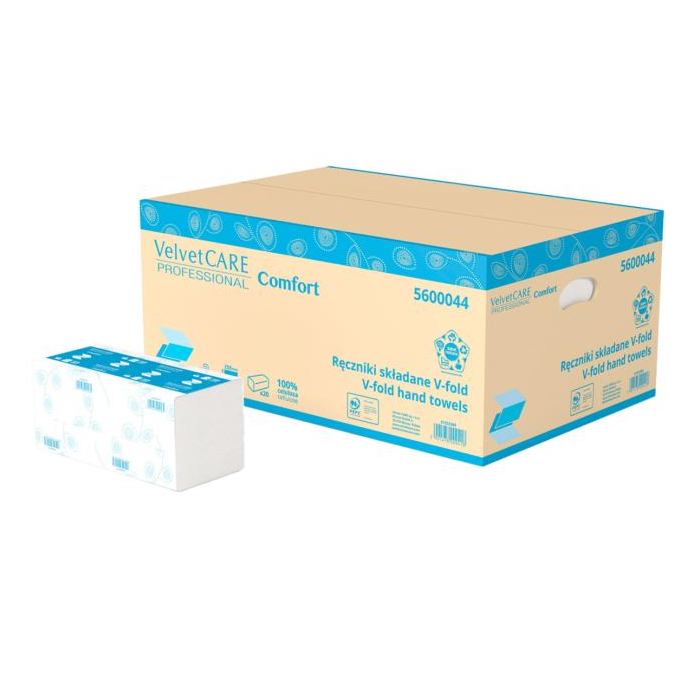 Mäkké, pevné a savé uteráky Velvet CARE Professional V Fold 23x25 cm - 100% celulóza, 2 vrstvy, 150 ks v balení, 3000 ks v kartóne (20x150 ks)
