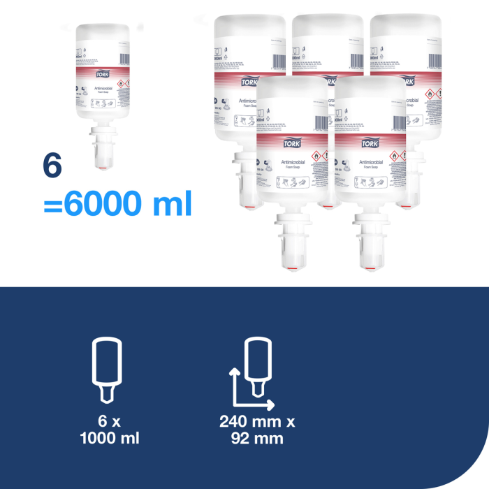 Jednorazová náplň penového mydla prémiovej kvality do dávkovačov TORK, ktoré sú overené ako ľahko používateľné a všetkým používateľom zabezpečujú správnu hygienu rúk. Vysokokvalitné mydlo, jednoduchá výmena v priebehu niekoľkých sekúnd. Dôkladne si umývajte ruky s TORK antimikrobiálnym penovým mydlom s certifikátom EN 1499. Jeho nízkoalkoholová receptúra je vysoko účinná proti baktériám, vírusom a kvasinkám. Je kombináciou bežného mydla na ruky a dezinfekcie v jednom umývacom prostriedku. Je tiež bez pridaných vôní a farbív, čo znižuje alergické reakcie.Obsahuje 2 500 dávok. Vôňa alkoholu. Objem 1 liter.