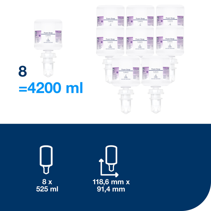 Rozmaznajte svojich návštevníkov dotykom luxusu vďaka Tork luxusnému penovému mydlu. Luxusne parfumované zloženie obohatené o prírodný výťažok z magnólie a hydratujúce zložky obnovujúce lipidy pre luxusný a krémový zážitok z umývania rúk. Vhodné pre Tork mini zásobníky na mydlá a dezinfekčné prostriedky, ktoré sú overené ako ľahko používateľné a všetkým používateľom poskytujú správnu hygienu rúk.