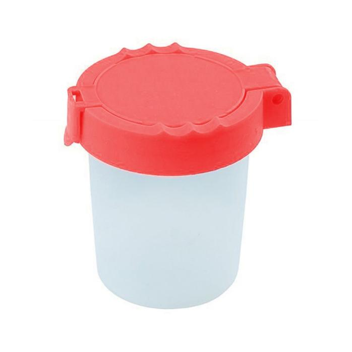 Praktický plastový pohárik na vodu výšky 9 cm s vrchnákom, ktorý zabraňuje vytekaniu obsahu. Vhodný pre vodou riediteľné farby, príp. na odkladanie štetcov. Obsah 150 ml. Priehľadné telo, vrchnák v červenej a modrej farbe.