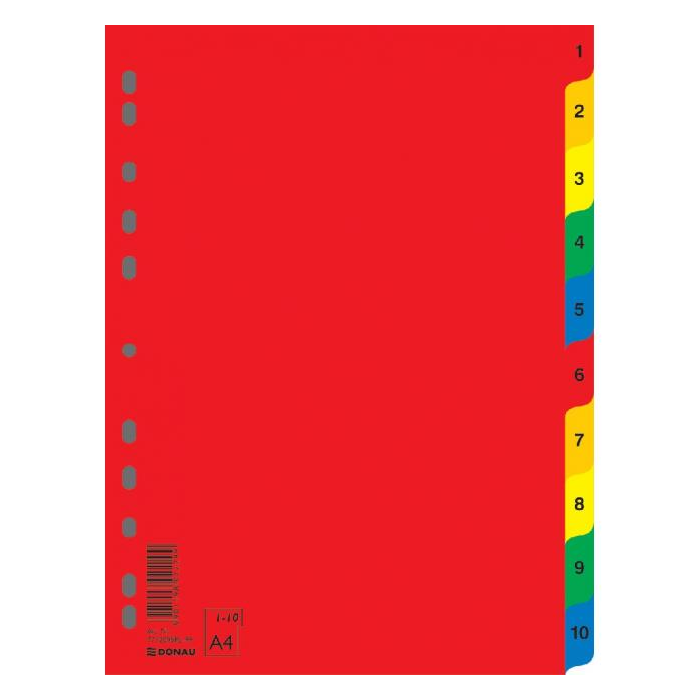 Rozraďovač formátu A4 vyrobený z tuhého polypropylénu. Jednotlivé stránky v rôznych farbách, multiperforácia na použitie rozraďovača v krúžkovom aj pákovom zakladači. Väčšie balenie 25 sád. Rozmery 230x297mm Označenie rozraďovačov: 1-10