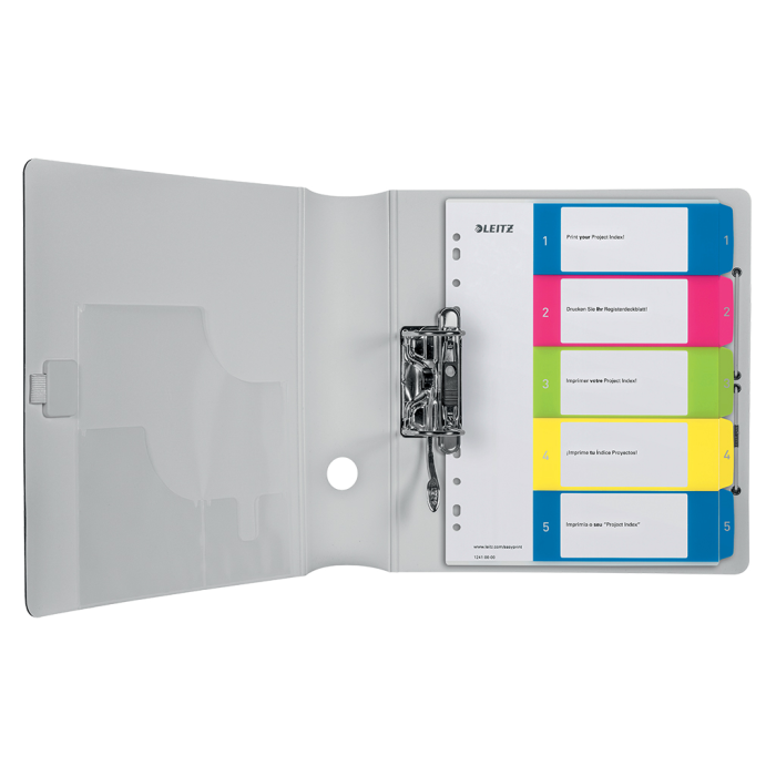 Opakovane použiteľný a extra odolný plastový číselný rozraďovač 1 - 5 v žiarivých farebných kombináciách s univerzálnou perforáciou. Materiál odolný polypropylén hrúbky 0,3 mm. Formát A4 maxi. Možnosť potlače na upravenie podľa vlastných potrieb, predloha stiahnuteľná zdarma na www.esselte.com/ easyprint.