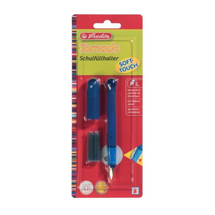 Plniace bombičkové pero L - Tornado - pre ľavákov, hrot z ušľachtilej ocele, ergonomické pogumované držanie, nálepka s menom, balenie v blistri, mix farieb.