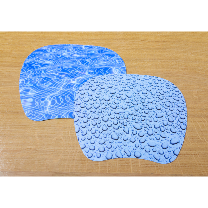 Podložka pod myš iba 1 mm hrubá. Vhodná pre optické myši. Rozmery 212 × 1 × 172 mm. Motív voda.