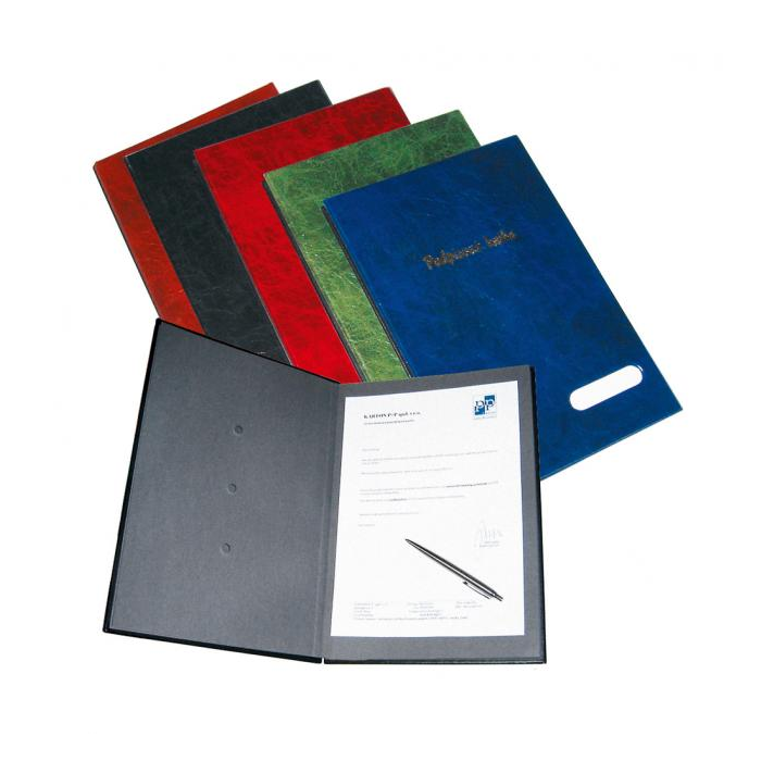 Podpisová kniha 14-dielna s okienkom na prednej strane na jednoduchú výmenu popisovateľného štitka, rozťahovateľný chrbát pre zvýšenie kapacity. Úprava v imitácii kože.