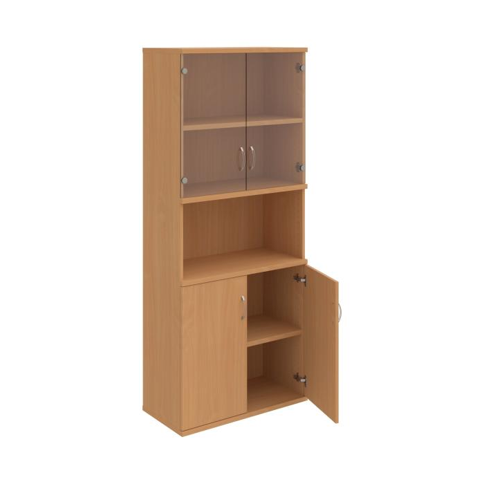 Kombinovaná skriňa - dvere/nika. Kancelárske skrine STRONG majú robustnú konštrukciu a vyššiu nosnosť políc ako bežné kancelárske skrine.V ponuke sú skriňové moduly s výškou 185 cm, 111 cm alebo 74 cm a šírky 80 cm alebo 40 cm. Hĺbka všetkých modelov skriňového radu STRONG je 40 cm.Chrbát, vyrobený z 8 mm hrubých dosák, je obojstranne pohľadový, takže skrine môžete použiť ako priestorový deliaci prvok. Hrúbka samotných políc je 25 mm, čo znamená nosnosť 80 kg na 1 policu.Korpusy, dvierka a police skríň sú olepené odolnou 2mm ABS hranou, ktorá garantuje dostatočnú ochranu proti poškodeniu.