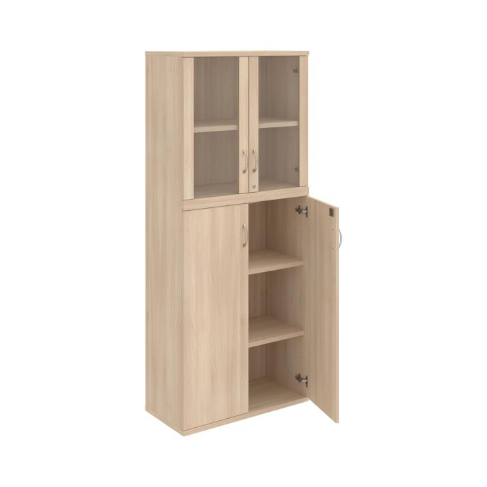 Kombinovaná skriňa - dvere/nika. Kancelárske skrine STRONG majú robustnú konštrukciu a vyššiu nosnosť políc ako bežné kancelárske skrine.V ponuke sú skriňové moduly s výškou 185 cm, 111 cm alebo 74 cm a šírky 80 cm alebo 40 cm. Hĺbka všetkých modelov skriňového radu STRONG je 40 cm.Chrbát, vyrobený z 8 mm hrubých dosák, je obojstranne pohľadový, takže skrine môžete použiť ako priestorový deliaci prvok. Hrúbka samotných políc je 25 mm, čo znamená nosnosť 80 kg na 1 policu.Korpusy, dvierka a police skríň sú olepené odolnou 2mm ABS hranou, ktorá garantuje dostatočnú ochranu proti poškodeniu.