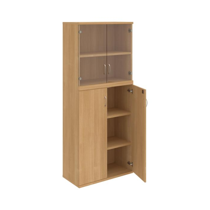 Kombinovaná skriňa - dvere/nika. Kancelárske skrine STRONG majú robustnú konštrukciu a vyššiu nosnosť políc ako bežné kancelárske skrine.V ponuke sú skriňové moduly s výškou 185 cm, 111 cm alebo 74 cm a šírky 80 cm alebo 40 cm. Hĺbka všetkých modelov skriňového radu STRONG je 40 cm.Chrbát, vyrobený z 8 mm hrubých dosák, je obojstranne pohľadový, takže skrine môžete použiť ako priestorový deliaci prvok. Hrúbka samotných políc je 25 mm, čo znamená nosnosť 80 kg na 1 policu.Korpusy, dvierka a police skríň sú olepené odolnou 2mm ABS hranou, ktorá garantuje dostatočnú ochranu proti poškodeniu.