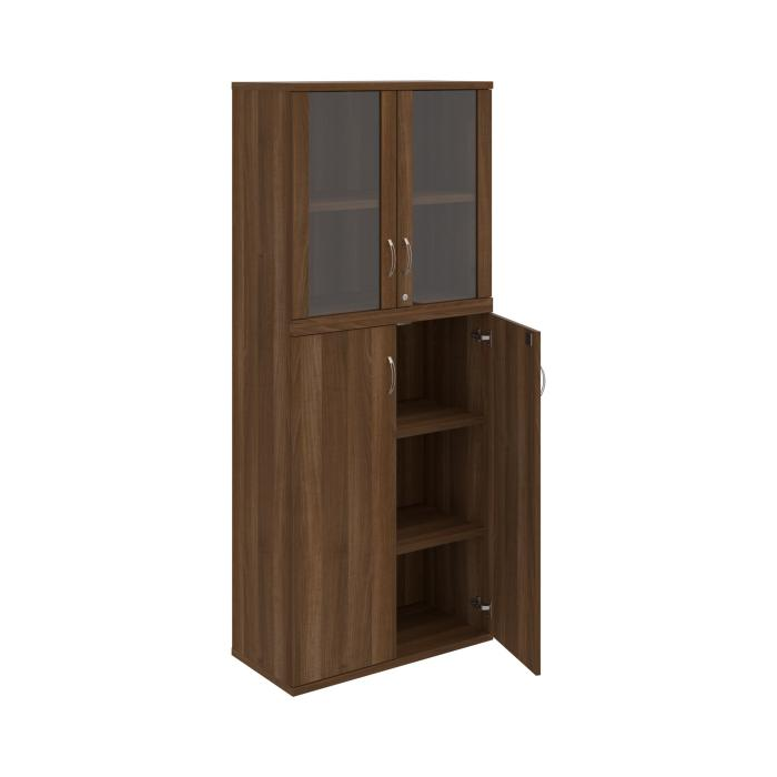Kombinovaná skriňa - dvere/nika. Kancelárske skrine STRONG majú robustnú konštrukciu a vyššiu nosnosť políc ako bežné kancelárske skrine.V ponuke sú skriňové moduly s výškou 185 cm, 111 cm alebo 74 cm a šírky 80 cm alebo 40 cm. Hĺbka všetkých modelov skriňového radu STRONG je 40 cm.Chrbát, vyrobený z 8 mm hrubých dosák, je obojstranne pohľadový, takže skrine môžete použiť ako priestorový deliaci prvok. Hrúbka samotných políc je 25 mm, čo znamená nosnosť 80 kg na 1 policu.Korpusy, dvierka a police skríň sú olepené odolnou 2mm ABS hranou, ktorá garantuje dostatočnú ochranu proti poškodeniu.