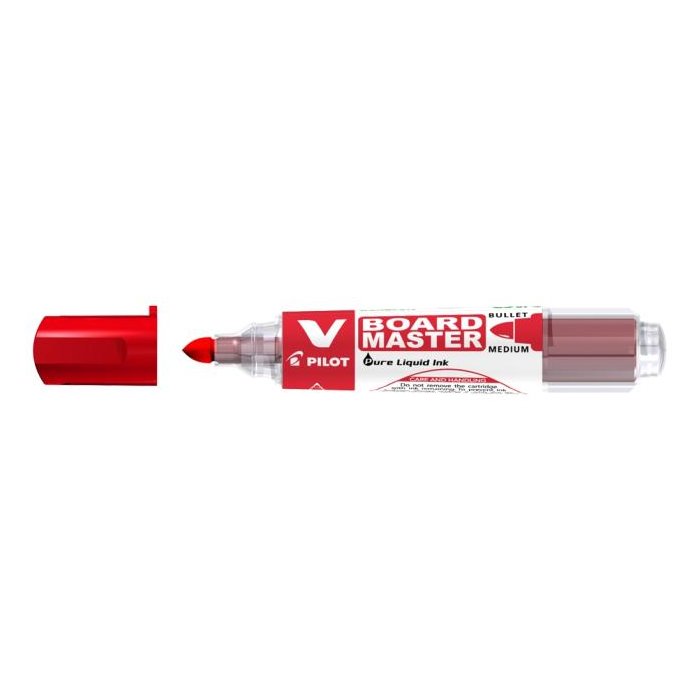Popisovač na biele tabule s vymeniteľnou náplňou na alkoholovej báze. Priemer hrotu 6 mm, šírka stopy 2,3 mm. Farba červená.
