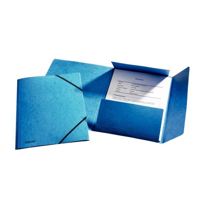 Obal A4 s tromi chlopňami a čiernou gumičkou. Materiál na dotyk príjemný prešpán. Prelisy na chlopniach a chrbte zvyšujú kapacitu obalu. Väčšie balenie 10 ks. Farba: modrá