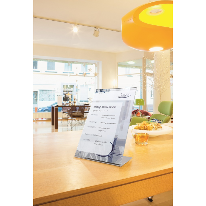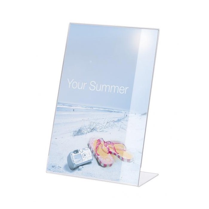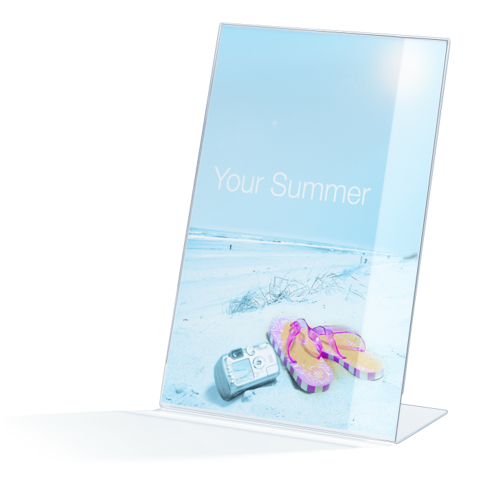 Stojan vhodný na prezentáciu ľubovoľných informácií. Vyrobený z kvalitného číreho akrylu. Samolepiace gumové podložky zabezpečujú dobrú stabilitu. Formát A4.
