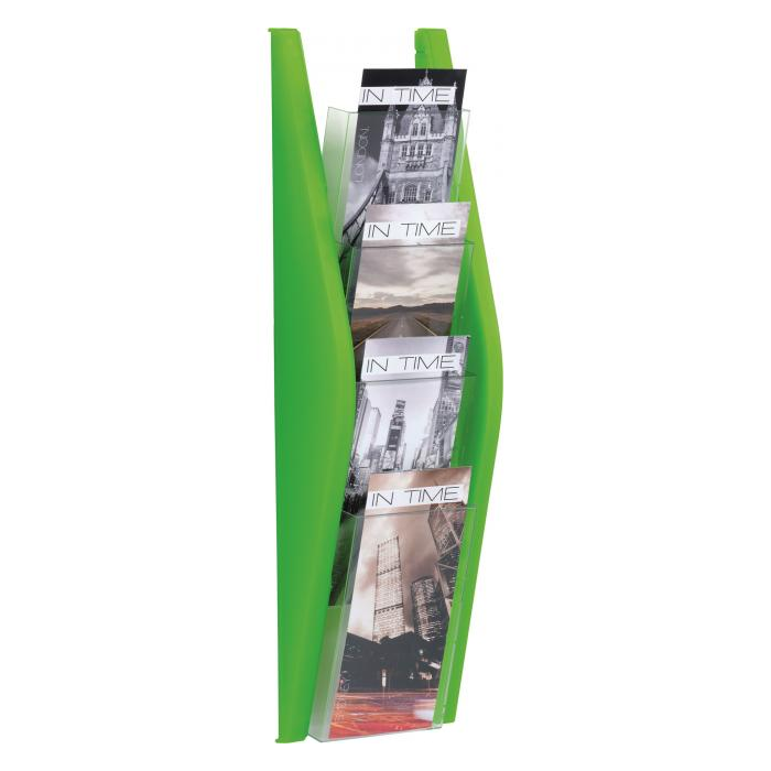 Nástenný stojan na prezentáciu materiálov. Štyri priehľadné priehradky slúžia na umiestnenie materiálov formátu 1/3?A4. Materiál kvalitný plast. Rozmery (š×v×h) 165×540×80 mm. Farba zelená.