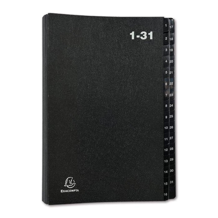 Pultová triediaca kniha na triedenie dokumentov presahujúcich veľkosť A4 do rozmerov 235 × 335 mm. Plastový poťah a rozťahovateľný chrbát. Oddiely 1-31. Farba čierna.