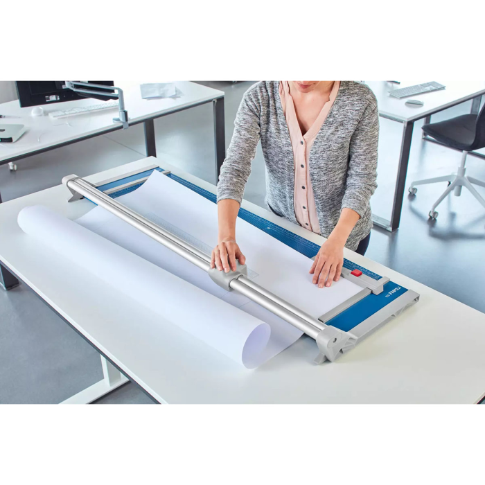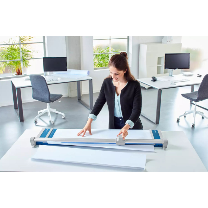 Profesionálna rezačka s kovovou základňou a presným rezom na grafické účely (filmy, fólie, papier). Kruhový nôž umiestnený v plastovom ochrannom kryte sa automaticky brúsi pri rezaní o protinôž - oba nože z tvrdenej ocele. Automatický prítlak pohybom rezacej hlavy, zadný doraz. Mierka v cm/inch. Na pracovnom stole sú vyznačené formáty DIN. Možnosť montáže na stenu.