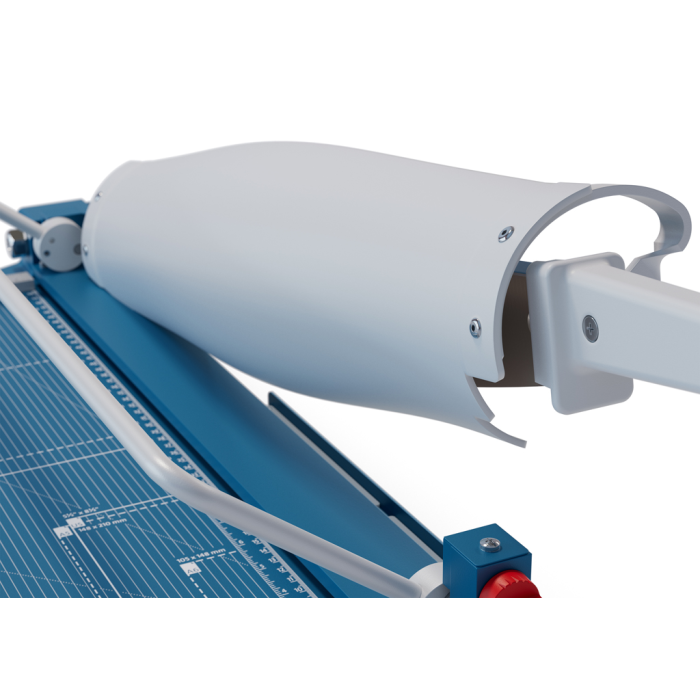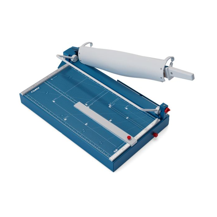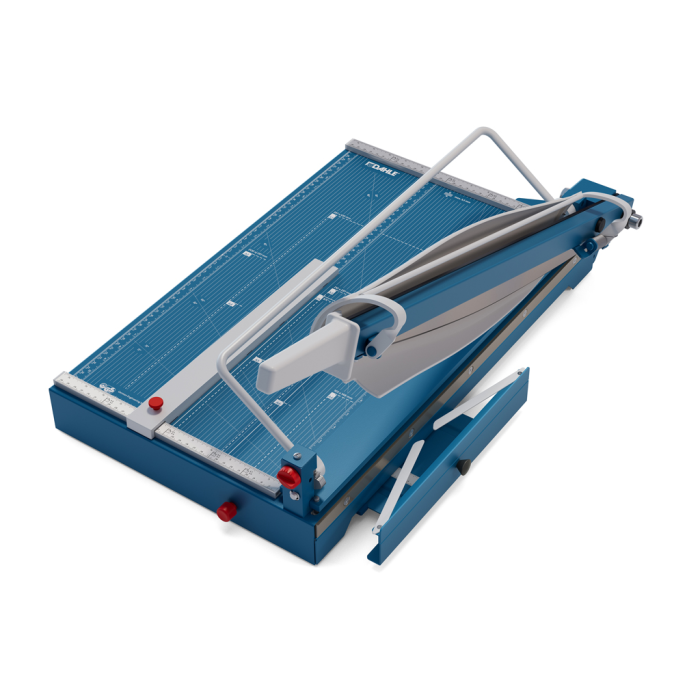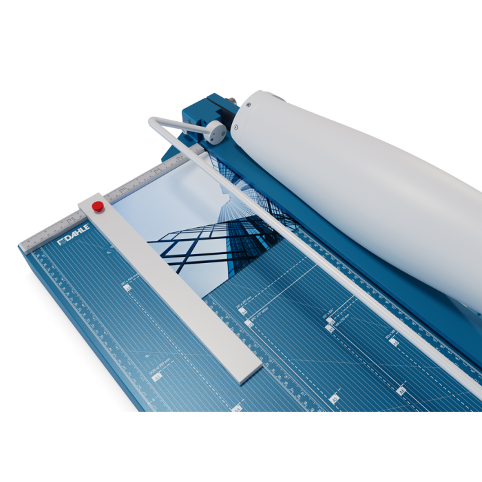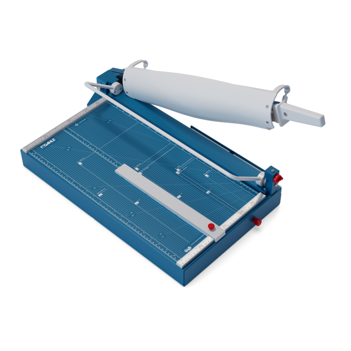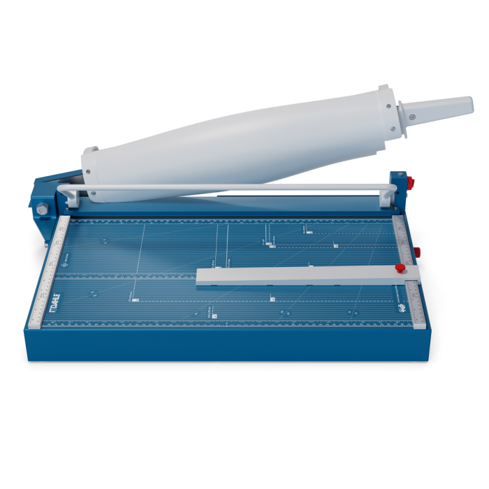 Vysokokvalitná, protišmyková a robustná páková rezačka z pevného oceľového plechu na rezanie papiera, kartónu, kože, plastu. Formátovacie čiary na stole pomáhajú zarovnávať materiály s praktickou milimetrovou stupnicou pozdĺž reznej hrany. Pohodlná práca s robustnou rukoväťou pre optimálny prenos sily zhora a tvarovaným chráničom prstov. Brúsený vrchný a spodný nôž z kvalitnej nožiarskej ocele Solingen, automatický ochranný kryt, rotujúci okolo ostria, výsuvný predný doraz roztiahnuteľný do 210 mm, prítlak pomocou prítlačnej páky, 2 bočné dorazy. Presná mierka v cm/inch a DIN formátoch. Veľkosť stola 600 × 365 mm.