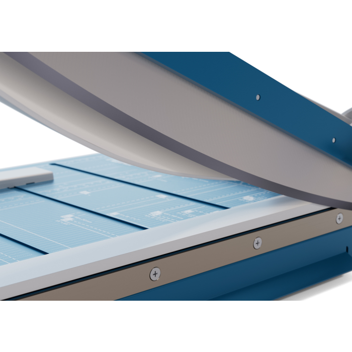 Vysokokvalitná, protišmyková a presná páková rezačka z pevného oceľového plechu. Základný vrchný a základný spodný brúsený nôž vyrobený z kvalitnej nožiarskej ocele Solingen. Rotujúci kryt okolo ostria chráni prsty pred náhodným porezaním. Presná mierka v cm/ inch a DIN formátoch, čiary umožňujúce rezanie uhlových rezov. Automatický prítlak. Výrez na spodnej časti na pohodlné prenášanie. K rezačke je možné objednať podporný stôl so zariadením na rezanie tenkých prúžkov a zariadenie umožnujúce vytvoriť laserový lúč, indikujúci reznú líniu.