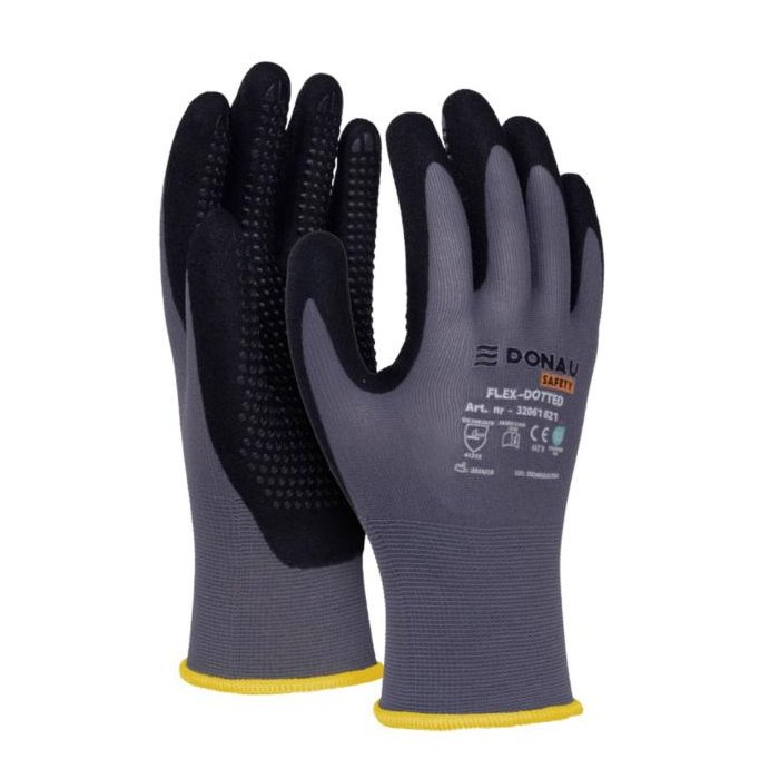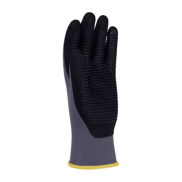rukavice z kvalitnej pletenej nylonovej tkaniny s elastanom v šedej farbe, v úchopovej časti potiahnuté ultra jemnou nitrilovou penou s čiernym bodkovaním