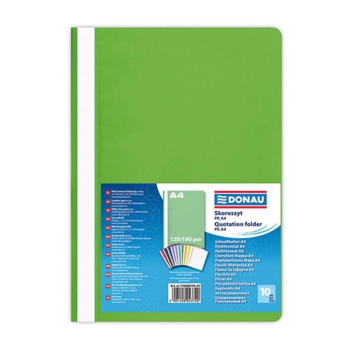 Štandardný polypropylénový rýchloviazač s priehľadnou prednou stranou a nasúvacím popisným pásikom. Formát A4. Balenie 10 ks.