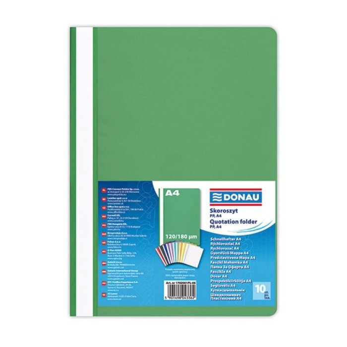 Štandardný polypropylénový rýchloviazač s priehľadnou prednou stranou a nasúvacím popisným pásikom. Formát A4. Balenie 10 ks.