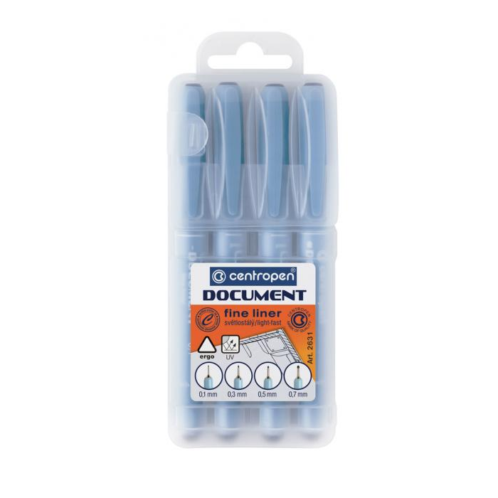 Špeciálne jednorazové grafické linery na vyťahovanie čiar, skicovanie a kreslenie. Dokumentačný atrament svetlostály a vodeodolný. Dĺžka stopy 500 až 600 m. Dodávané v sade 4 ks s hrotmi 0,1mm, 0,3 mm, 0,5 mm a 0,7 mm.