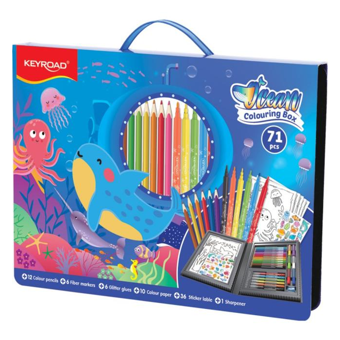 Prebuďte svoju umeleckú vášeň so sadou KEYROAD. 65 dielikov v praktickej krabičke s rúčkou. Sada je ideálna pre milovníkov umenia, mladých aj starých, ktorí sa chcú vyjadriť rôznymi spôsobmi. Obsah: 12 farebných ceruziek, 6 fixiek, 6 trblietavých lepidiel v tyčiniek, 10 omaľovánok, 30 nálepiek a strúhadlo. Balenie: krabička s rúčkou. Vzor: Oceán. Farba: Modrá.
