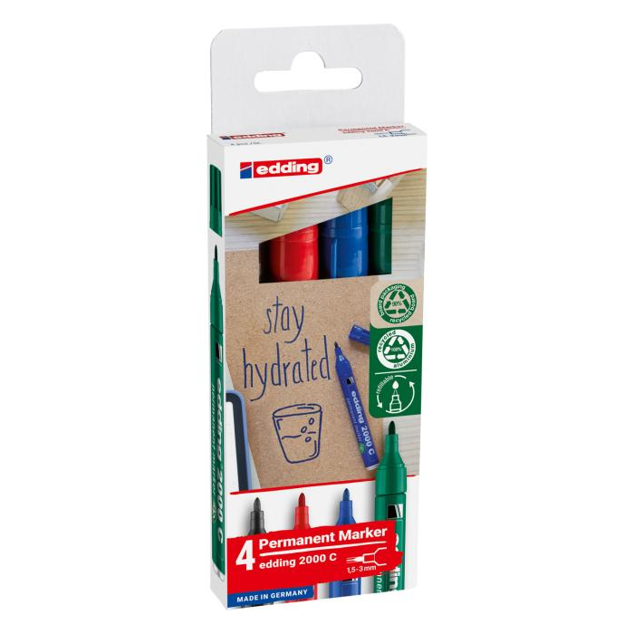 Sada 4 permanentných popisovačov na trvanlivé popisovanie, značenie, maľovanie a vyznačovanie takmer na všetky materiály vrátane kovu, skla a umelých hmôt. Hliníkový obal vo farbe popisovača, vymeniteľné špičky. Dopĺňateľné atramentom edding T 25 alebo MTK 25. Svetlostály, rýchloschnúci, nezmazateľný a vodeodolný atrament neobsahuje to­luén/-xylén. Hrot okrúhly, šírka stopy 1,5-3 mm.