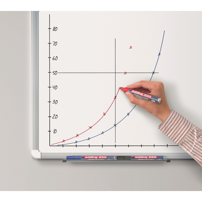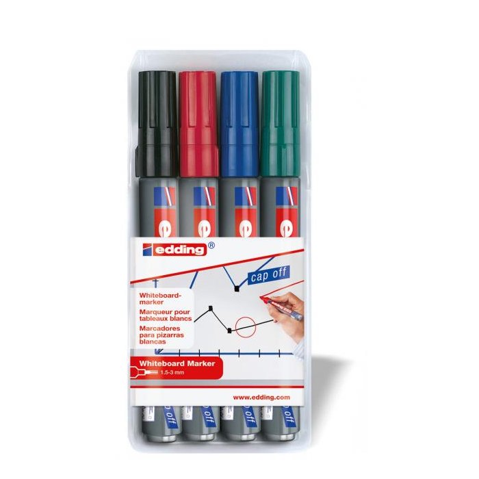 Popisovač na biele tabule, zasucha stierateľný. Plnený pigmentovým atramentom slabého zápachu bez prísady butylacetátu s vlastnosťou `Cap off`, zabraňujúcou vysychaniu atramentu pri otvorenom hrote aj niekoľko dní. Dopĺňateľný atramentom edding BT 30 alebo BTK 25. Hliníkové telo, vymeniteľný hrot. Hrot okrúhly, šírka stopy 1,5 - 3 mm. Dodávaný v sade 4 ks.