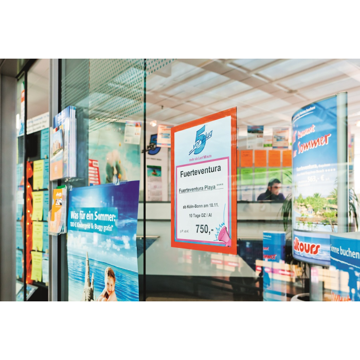 Samolepiaci informačný panel s prednou magnetickou časťou. Ideálny na vystavovanie kľúčových informácií, špeciálnych oznamov alebo dôležitých čísel. Informácie sa ľahko vymieňajú a sú čitateľné z oboch strán, ak sa panel umiestni napr. na okno alebo priehľadné dvere. Vhodný na hladké a pevné povrchy. V prípade potreby je ľahko premiestniteľný bez potreby vŕtania. Rámik vo formáte A3. Farba červená.