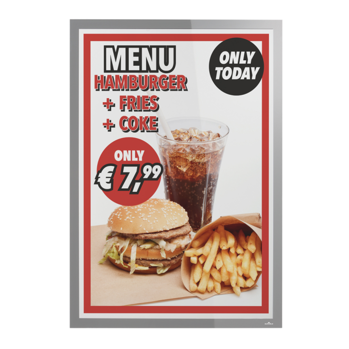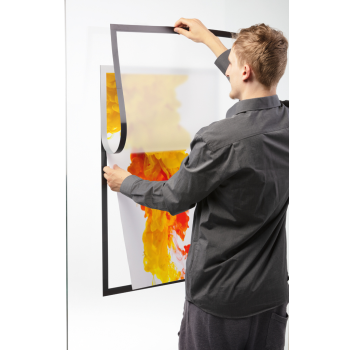 Technické parametre: • informačný rám DURAFRAME® POSTER je vhodný na zobrazovanie informácií na stenách, sklenených plochách a oknách • rýchle vkladanie a jednoduchá výmena plagátov pomocou sklopného magnetického rámu • bezbublinkové pripevnenie vďaka dvom pásikom s lepidlom na chrbte • odstraňovanie z povrchu bez zvyškov • tepelne stabilný do cca. 70 stupňov • UV-stabilizovaný až na 2 roky • čitateľné na oboch stranách skla • pojme dva plagáty s hmotnosťou 150 g/m2 • identický vzhľad rámu z oboch strán • navrhnuté pre formáty na výšku aj na šírku.
