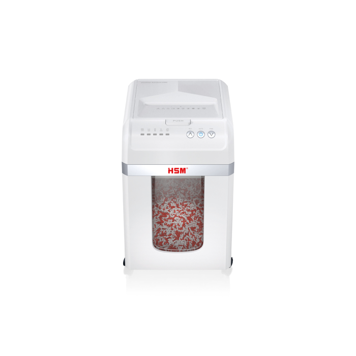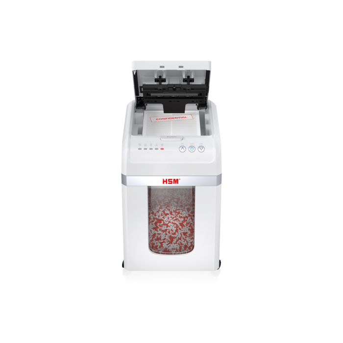 Plne automatický skartovač dokumentov vám poskytuje bezproblémové zabezpečenie údajov. Stačí vložiť stoh papiera, zatvoriť vrch - a zariadenie sa postará o zvyšok. Skartovač dokumentov s automatickým podávaním skartuje až 200 listov na častice, ktoré zodpovedajú úrovni zabezpečenia P-4 (4x12 mm), čím zaisťuje zabezpečenie údajov v súlade s GDPR.