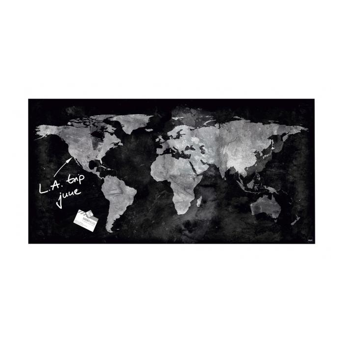 Magnetické tabule z tepelne tvrdeného bezpečnostného skla (EN 12150-1) hrúbky 15 mm s jednoduchou a bezpečnou montážou s certifi kátom TUV dodajú vašim kanceláriám, konferenčným miestnostiam, jedálňam i domácnostiam exkluzívny vzhľad. Sú popisovateľné kriedovými popisovačmi Sigel a za sucha zotierateľné utierkou z mikrovákna. Súčasťou balenia sú 3 super silné neodymové magnety a montážny materiál. Pri používaní príslušenstva Sigel je garantovaná 25-ročná záruka na magnetický sklenený povrch tabule. Rozmery 91 × 46 cm. Dizajn mapa sveta.