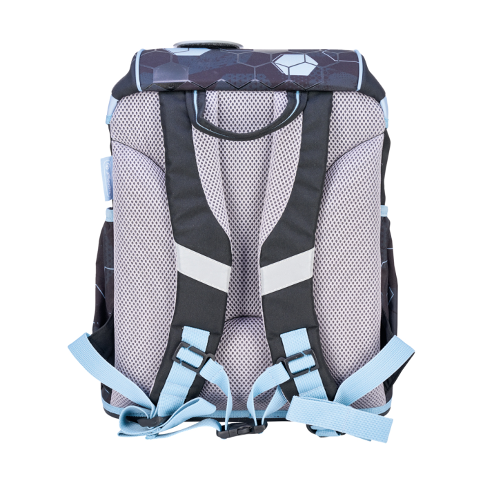Školská taška s výbavou, s anatomicky tvarovaným polstrovaným a priedušným chrbtom, nastaviteľnými ramennými popruhmi, predným vreckom na zips, dvomi bočnými vreckami s elastickými pásikmi, stabilnou spodná doskou s nožičkami, pohodlnou rukoväťou, reflexnými prvkami Oralite, zatváranie Click lock zips, 1 x odnímateľný odznačik na suchý zips, 1 x dekoratívny prvok. Hmotnosť 800 g, objem 22 l, rozmery: 39 x 32 x 25 cm. Vode-odolná, bez PVC, výbava: peračník prázdny 2 chlopne, vrecko na prezuvky, oválne puzdro.