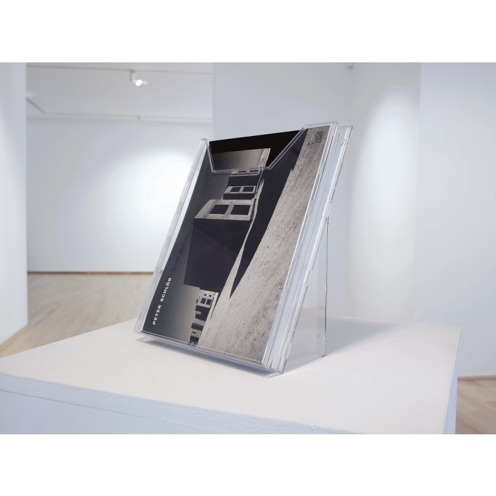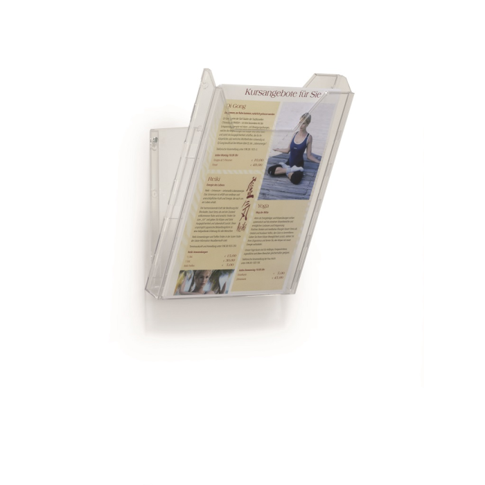 Kombinovaný stojan s jedným odkladačom na prospekty a časopisy formátu A4 s jedným odkladačom a závesným dielom na stenu, resp. stôl. Tento základný modul je možné rozšíriť pridaním ďalších odkladačov DU8579 19. Materiál priehľadný plast.Vnútorné rozmery 240 × 311 mm.
