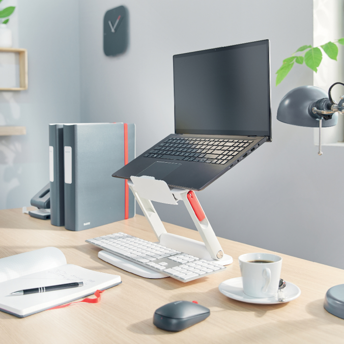 Viacuhlý stojan na notebook Leitz Ergo dvíha obrazovku notebooku do ideálnej ergonomickej výšky, čím zvyšuje pohodlie pri sledovaní a pomáha zlepšiť držanie tela. Rôzne kombinácie výšky a uhla vrátane horizontálneho nastavenia s malými rozmermi pre kompaktné stoly. Použitie stojana pod notebook tiež podporuje prúdenie vzduchu, čím sa zabraňuje prehrievaniu batérie notebooku a ďalších komponentov a notebook si tak udržuje vysokú úroveň výkonu.