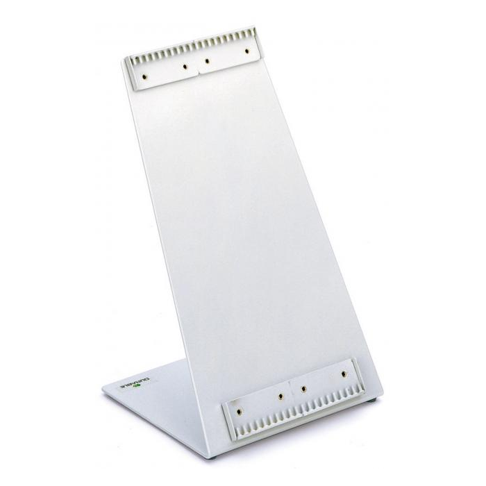 Extrémne pevný odľahčený kovový stojan v tvare L. Plastový poťah odolný voči oderu. Dodávaný prázdny s kapacitou na 20 panelov. Farba sivá.