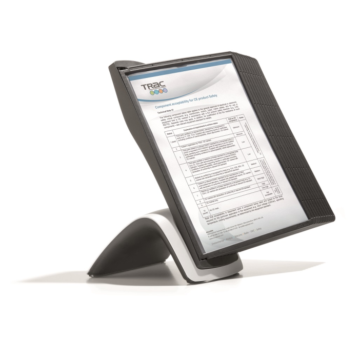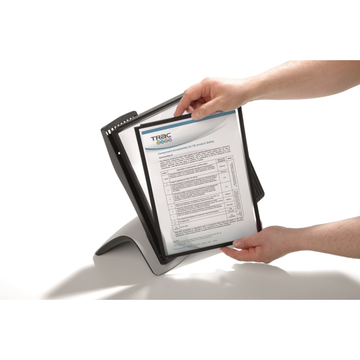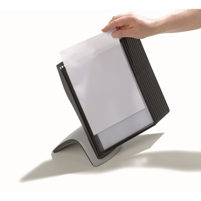 Štýlový stojan na stôl dodávaný s 10 displejovými panelmi SHERPA a indexami. Ideálny do kancelárií a na verejne prístupné miesta. Otvor na hornej strane panelu zabezpečuje jednoduché vkladanie a v prípade potreby rýchlu výmenu vložených materiálov. Farba panelov čierna.