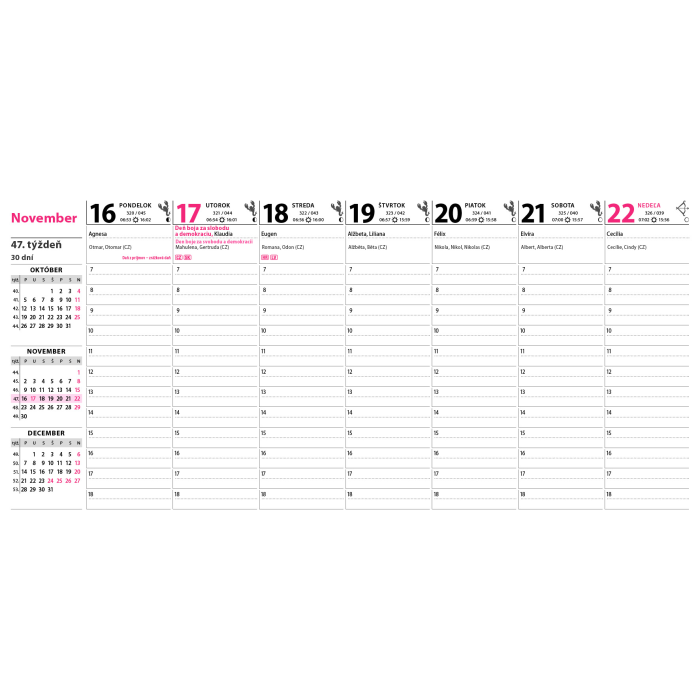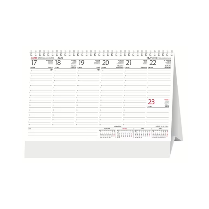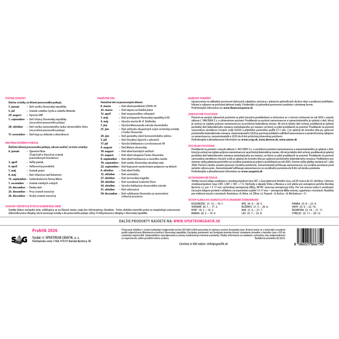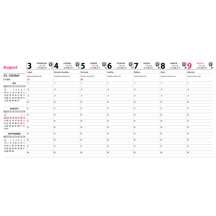 Praktický stĺpcový kalendár s prehľadom najbližších mesiacov na ľavej strane. Dostatok miesta na plánovanie celého týždňa. Obsahuje dane, sviatky v EU, východy a západy slnka, fázy mesiaca.